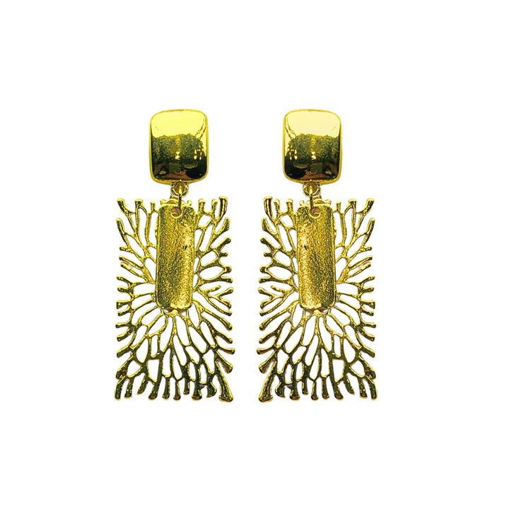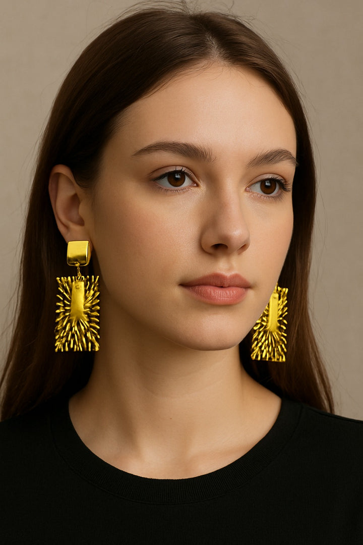 Shine bright with these stunning rectangular statement earrings 🌟, featuring a radiant gold finish 💛 and a unique sunburst-inspired texture 🌞. Perfect for adding elegance and a modern edge to your look 👗, whether you’re heading to a glamorous evening ✨ or making a bold fashion statement 💃.