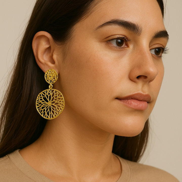 Our Gold Web Earrings – Elegant Mesh Hollow 💎 bring together modern artistry 🎨 and timeless elegance 👑. Featuring a delicate mesh hollow design 🪡 within a classic round silhouette 🔵, these earrings sway beautifully with every step 💃, adding a hint of sparkle to your look.